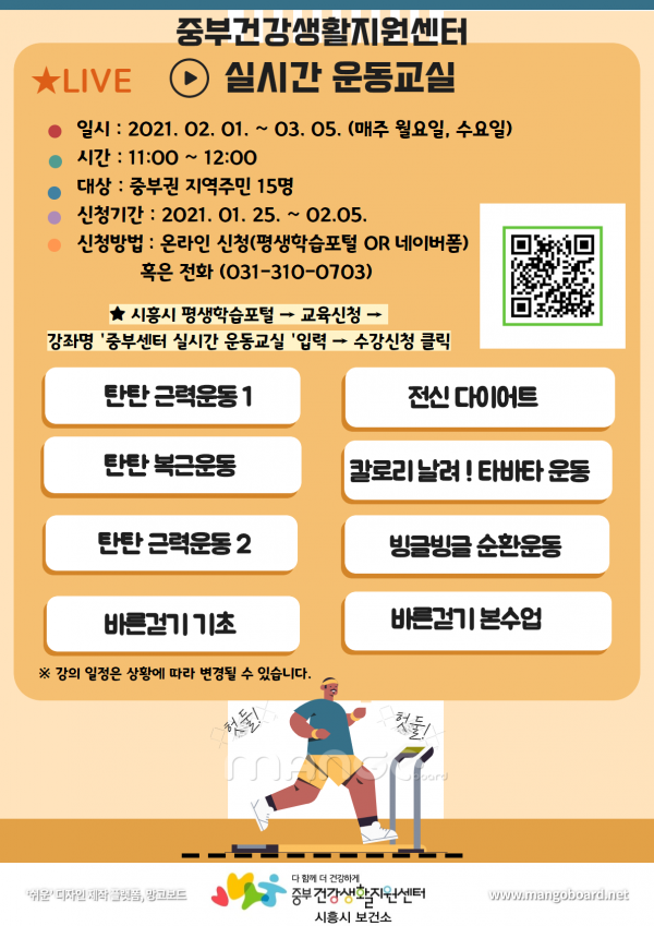 시흥시보건소 관계자는 “중부권 지역주민이 온라인 운동교실 참여를 통해 코로나19로 지친 일상을 회복하고 삶에 활력을 찾길 바란다”고 전했다.