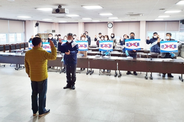 [피디언] 장흥읍 행정복지센터 직원들은 지난 1월 29일 3층 회의실에서 청렴 문화를 확산하고 공정한 사회를 조성하기 위한 ‘7대 적폐 척결 결의대회’를 가졌다고 밝혔다.