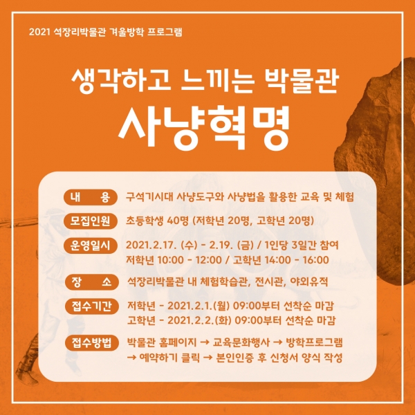 이번 프로그램은 ‘사냥혁명’을 주제로 석장리박물관 특별기획전과 연계해 구석기 시대 사냥도구와 사냥법을 배우고 구석기인들의 사냥문화를 직접 체험해 보는 시간으로 진행된다.