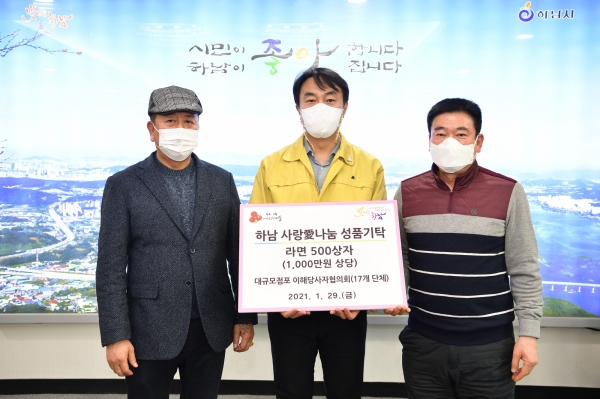 [피디언] 하남시는 지난달 29일 대규모점포 이해당사자협의회가 이웃돕기 성품으로 1,000만원 상당의 라면 500상자를 시에 기탁했다고 밝혔다.