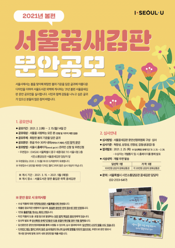 [피디언] 2021년 봄을 앞두고 서울시는 새로운 계절을 맞아 희망찬 봄의 기운 담은 글귀를 주제로 한 ‘서울꿈새김판 문안 공모’를 2월 15일까지 ‘서울시 홈페이지’접수 및 우편접수로 진행한다.