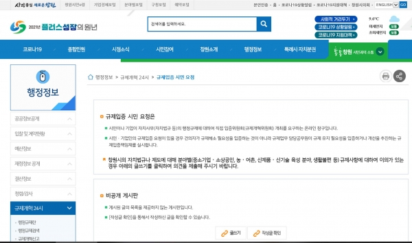 [피디언] 창원시는 2021년 플러스성장의 원년을 맞아 시민들이 규제개혁과 적극행정에 대한 확실한 변화를 체감할 수 있도록 시 홈페이지 규제개혁·적극행정 메뉴를 새 단장해 운영한다고 1일 밝혔다.