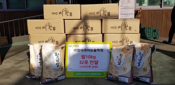 [피디언] 남양주시 다산동에 소재한 이영미 국어논술학원은 지난달 29일 이웃사랑 실천을 위한 쌀 10kg 32포를 남양주시복지재단 산하 남양주시 사회복지관 서부희망케어센터에 전달했다.