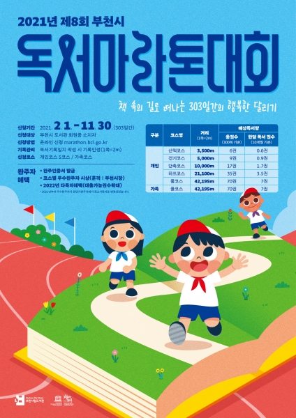 [피디언] 부천시립도서관은 2월 1일부터 11월 30일까지 303일간 독서와 마라톤을 접목한 생활 독서 운동인‘제8회 부천시 독서마라톤대회’를 개최한다.