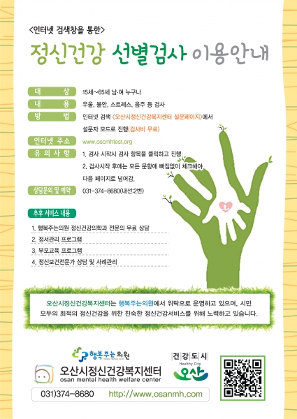 정신건강 선별검사는 ‘오산시 정신건강복지센터 설문페이지’ 와 핸드폰 앱에서 비대면으로 가능하다.