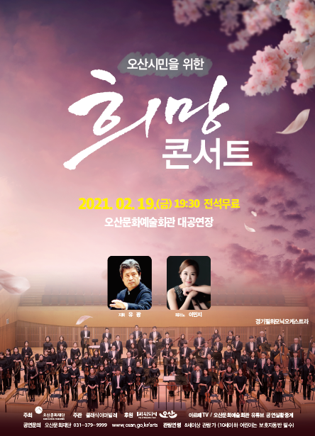 오산시민을 위한[희망콘서트]는 오는 2월 19일 19:30 오산문화예술회관 대공연장에서 만나 볼 수 있으며 2월 8일부터 사전 신청 / 선착순 온라인 을 통해 관람할 수 있다.