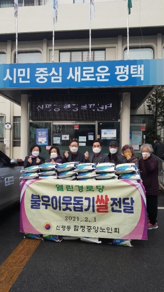 [피디언] 평택시 신평동 합정중앙경로당은 지난 1일 신평동행정복지센터를 방문해 저소득 이웃을 위해 써달라며 회원들이 십시일반 모은 성금으로 쌀 40포대를 전달했다.