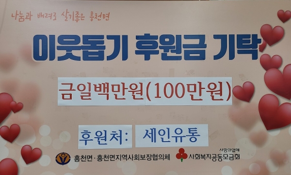 지난 2월 1일 여주시 흥천면 효지리 소재 세인유통이 이웃돕기 성금 100만원을, 관내 지역주민이신 김수영 동화작가가 덧신 50켤레를 흥천면행정복지센터에 기탁했다.