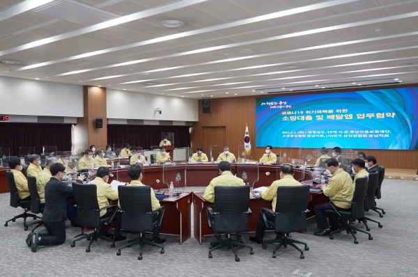 2일 충청남도청에서 진행된 소상공인 특례보증 협약에서 양승조 충남도지사, 오세현 아산시장을 비롯한 15개 시군의 시장·군수, 유성준 충남신용보증재단 이사장 등이 모여 소상공인 지원대책 마련에 대한 의견을 나눴다.