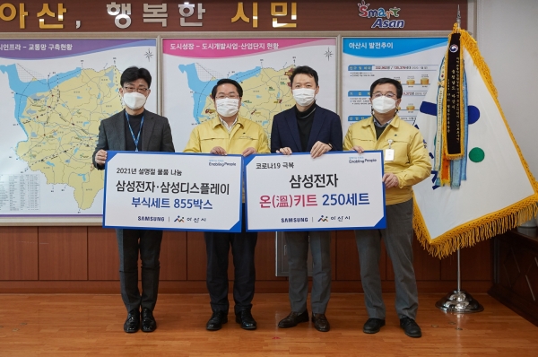 한편 삼성전자는 지난 1월 26일 한파와 폭설에도 ‘코로나19’ 확산방지를 위해 헌신하고 있는 아산시 임시선별진료소 의료진을 위해 임직원 250명이 1:1 매칭 방식의 기부참여로 조성된 1400만원 상당의 온키트를 지원했다.