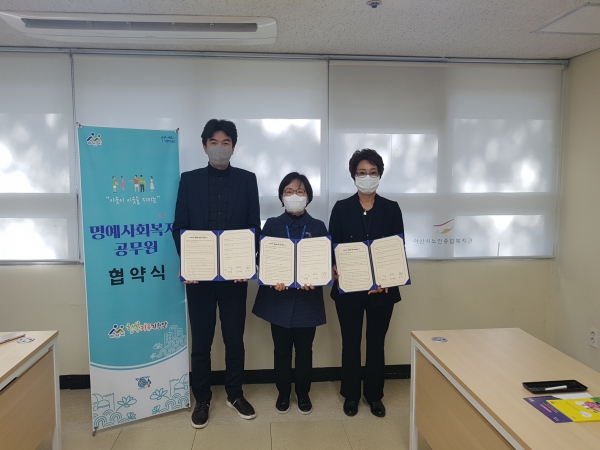 특강이 끝난 후 아산종합사회복지관 이세융 관장, 노인맞춤돌봄서비스 생활지원사 김선미 선임과 업무협약도 함께 진행했다.