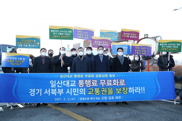 공동성명서에 따르면, “일산대교는 한강을 가로지르는 27개 교량 중 유일한 유료교량일 뿐만 아니라, km당 통행료가 660원으로 주요 민자도로 보다 6배 이상 높다”고 밝혔다.