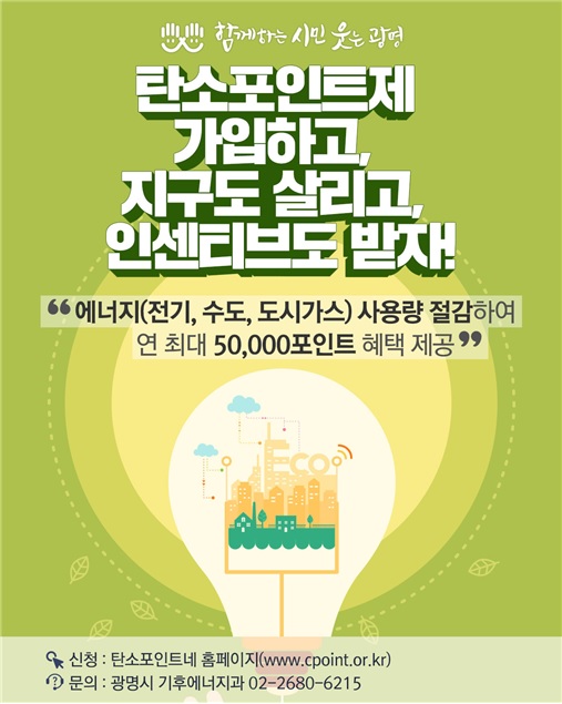 탄소포인트제는 2009년부터 시행되어 시민의 온실가스 감축 활동을 유도했으며 광명시는 지난해 탄소포인트제 운영으로 1,157톤의 온실가스를 감축하는 성과를 거뒀다.