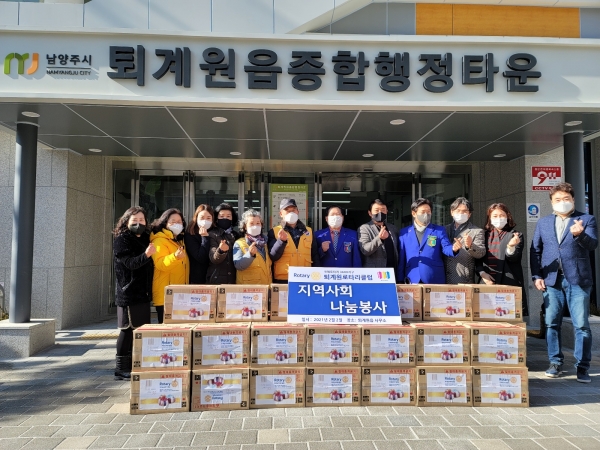 퇴계원읍사무소 이형진 읍장은 “설을 맞아 나눔을 실천해주신 퇴계원로타리클럽 최순철 회장님과 회원분들에게 감사드린다”며 “기탁한 물품은 관내 어려운 가정에 따뜻한 마음과 함께 정중히 전달하겠다”고 말했다.