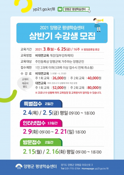 [피디언] 양평군에서는 2월 4일부터 21일까지 13일간 21년 상반기 평생학습센터 프로그램 수강생을 모집한다.