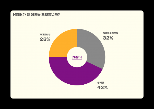 ‘한 개의 일자리로는 생활비가 부족해서’, ‘안정적인 수입이 보장되는 일자리를 구하기 어려워서’, ‘하고 싶은 일을 통해서는 수입이 안정적이지 않기 때문에’ 같이 어쩔 수 없이 필요에 의해서 선택한 생계형 N잡러가 43.2%로 가장 많았다.