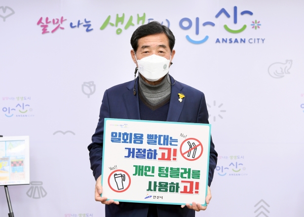 [피디언] 윤화섭 안산시장은 3일 집무실에서 최근 SNS를 통해 활발히 진행되고 있는 환경운동 ‘고고챌린지’ 캠페인에 동참하며 ‘일회용 빨대는 거절하고 개인 텀블러를 사용하겠다’고 약속했다.