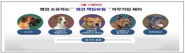 맹견으로 인한 개 물림 사고 등이 발생했을 때 사고 당사자에 대한 피해보상 체계가 미흡하다는 지적에 따라 지난해 2월 11일 ‘동물보호법’이 개정됐으며 오는 12일부터 맹견 소유자는 ‘맹견보험’에 의무적으로 가입해야 한다.