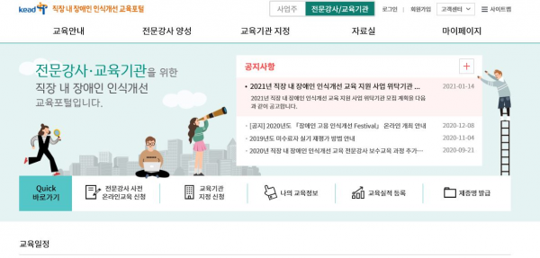 [피디언] 한국장애인고용공단이 2월 4일 오전 9시부터 2월 18일 오후 5시까지 직장 내 장애인 인식개선 교육포털을 통해 2021년 제1기 직장 내 장애인 인식개선 교육 강사 보수교육 과정 모집을 진행한다고 밝혔다.