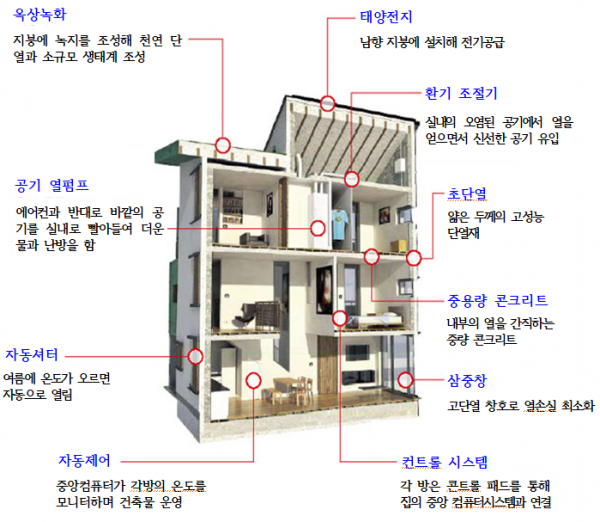제로에너지 건축물이란 에너지 및 온실가스 감축을 위해 건축물의 에너지 사용량을 최소화하고 신재생 에너지를 자체 생산해 건물의 총 에너지 소요량을 최소화하는 건축물을 말하며 제로에너지 빌딩 실현을 위해 고단열재 사용, 고기밀 창호 및 외부 차양 설치, 고효율 설비 적용, LED 사용, 에너지관리시스템 설치, 태양광, 지열 등 신재생에너지를 건축물에 활용하는 기술을 건축물에 적용한다.