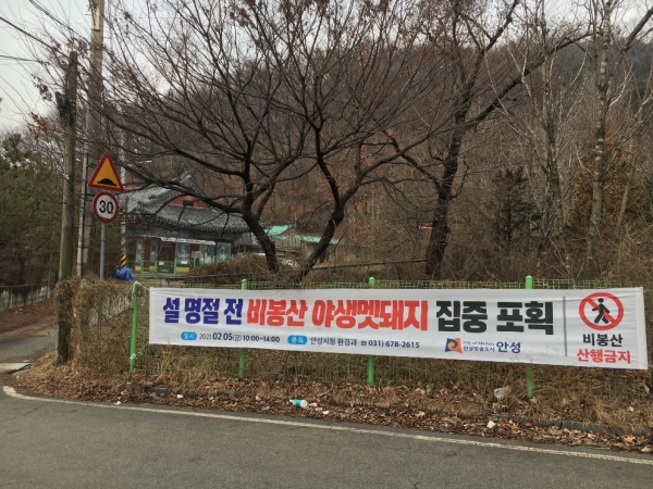 이에 안성시는 같은 피해사례를 사전에 방지하고자, 설 명절 전 비봉산 야생멧돼지 포획계획을 수립했고 포획활동 일자 및 시간, 등산로 통제 등을 안내하기 위해 지난 3일부터 재난문자 발송, 마을방송, 비봉산 주요 등산로에 산행금지 현수막을 게시하는 등 홍보를 실시했으며 5일 오전까지 홍보를 지속할 예정이다.