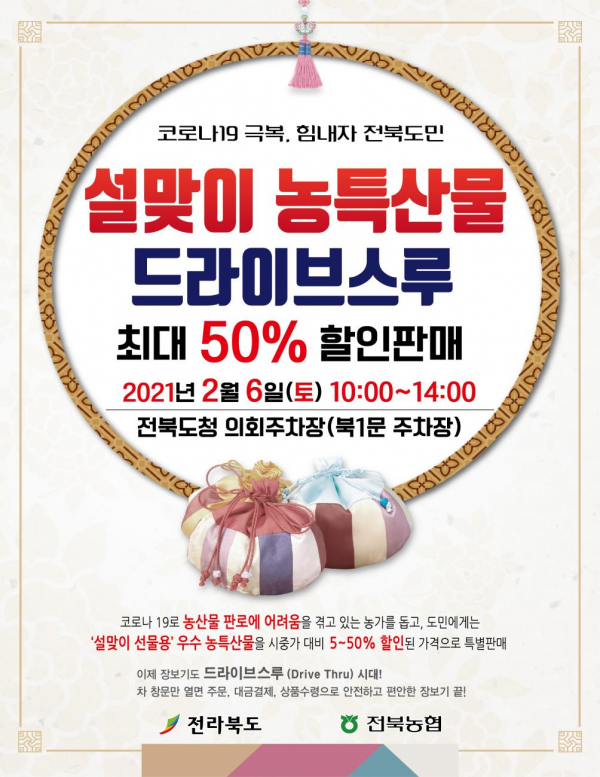 최재용 도 농축산식품국장은 “설 맞이 드라이브스루 특판행사를 통해 많은 도민들이 전북산 고품질 농특산물을 선물하고 따뜻한 마음도 전하는 설 명절이 되길 바란다” 면서 “농업인들에게 도움이 되고 지역경제가 다시 활력을 얻을 수 있는 포스트 코로나 시대를 대비하겠다”고 말했다.