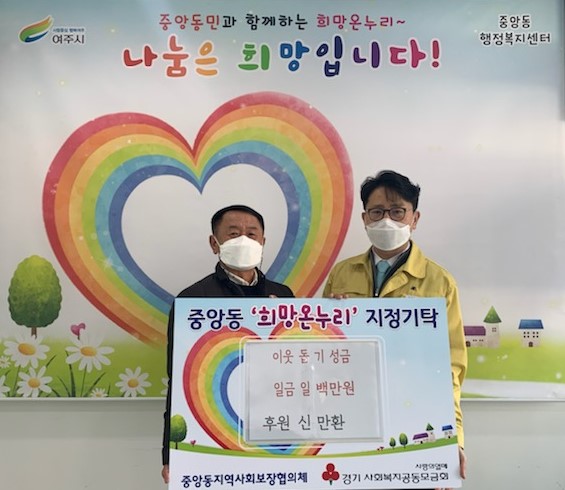 [한국Q뉴스] 지난 3일 중앙동체육회 신만환 회장이 중앙동행정복지센터를 방문해 이웃돕기 성금 100만원을 기탁했다.