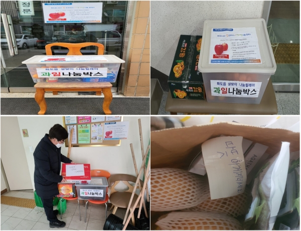 ‘1가정 1과일 나눔릴레이’는 장기적인 코로나19 및 경제악화 등의 여파로 설 명절에 과일 구입이 어려운 취약계층을 지원하기 위해 추진됐으며 화도읍지역사회보장협의체, 동부희망케어센터와 아파트 관리사무소가 협력해 아파트 내 과일나눔박스를 설치하고 주민들이 비대면으로 자유롭게 기부하는 방식으로 진행됐다.
