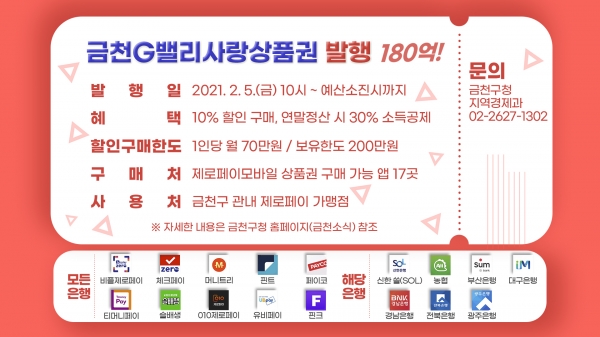 [한국Q뉴스] 금천구가 지역 내 소비를 촉진하고 소상공인 매출 증대를 도모하기 위해 2월 5일 오전 10시 180억 규모의 금천G밸리사랑상품권을 발행한다.