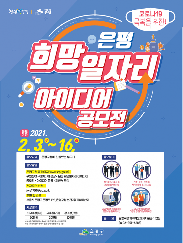 [한국Q뉴스] 은평구는 ‘은평 희망일자리 아이디어 공모전’을 통해 코로나19 펜데믹 지속으로 침체된 지역경제를 활성화할 수 있는 참신한 아이디어를 모집한다고 밝혔다.