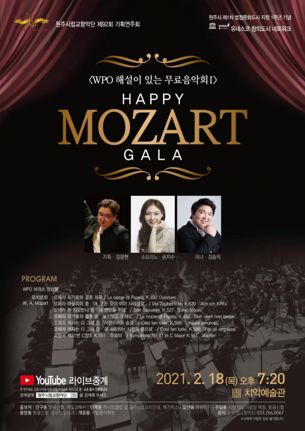 ‘Happy Mozart Gala’를 부제로 열리는 이번 연주회는 WPO 해설이 있는 무료음악회 첫 번째 시리즈로 WPO 브라스 앙상블 오프닝 무대 모차르트 피가로의 결혼 서곡 모차르트 아리아 모차르트 교향곡 제41번 ‘주피터’가 연주된다.
