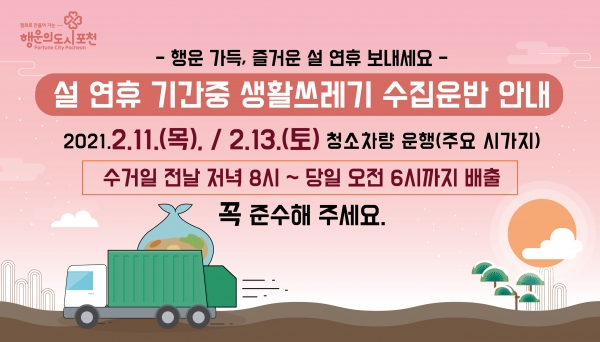 또한, 설 연휴가 시작되는 11일과 연휴 끝 무렵인 13일에 관내 생활폐기물을 수집 · 운반해 시민불편이 발생하지 않도록 적극 대처한다.