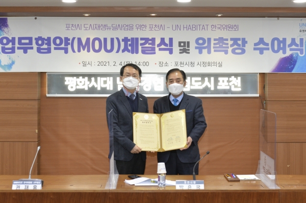 [한국Q뉴스] 포천시는 지난 4일 도시재생 뉴딜사업의 성공적인 사업수행을 위해 유엔해비타트 한국위원회와 업무협약을 체결했다.