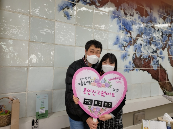 [한국Q뉴스] 포천시 소흘읍행정복지센터는 2월부터 혼인신고를 위해 민원실을 방문하는 신혼부부들의 행복한 출발을 축하와 기념, 즐거운 추억을 선사하고자 ‘사랑의 피켓 포토서비스’를 운영한다고 밝혔다.