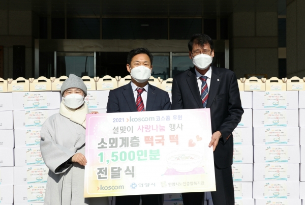 [한국Q뉴스] 3일 ㈜코스콤에서 설 명절을 맞아 안양시 노인종합복지관을 비롯한 무료경로식당 9개소에 떡국떡 1,500개를 전달하며‘착한기업과 함께하는 행복한 안양만들기 사업’의 첫 주자가 됐다.