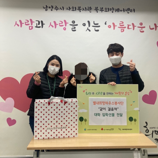 북부희망케어센터 김희정 센터장은 “뜻 깊은 사업을 진행할 수 있도록 도움 주신 별내희망하우스봉사단에 감사드린다”며 “지난해 수험생활을 했던 2002년생은 학창시절 중 3가지의 전염병을 겪은 유일한 세대이다.