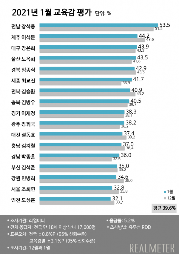 2018년 7월 취임 후 줄곧 전국 최상위권을 유지해온 장 교육감의 지지율은 취임 2년 7개 월 째인 2021년 1월 조사에서도 부동의 선두자리를 유지했다.