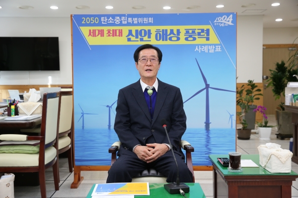 [한국Q뉴스] 박우량 신안군수는 2050 탄소중립특별위원회 지방정부추진단 발대식에 온라인으로 참석, 풍력발전분야의 모범사례를 발제해 참석자들의 큰 호응을 얻었다.
