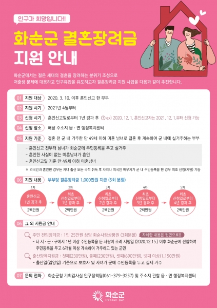 자세한 사항은 화순군청 누리집 ‘공지사항’ 게시물을 참고하거나 화순군 기획감사실 인구정책팀에 문의하면 된다.