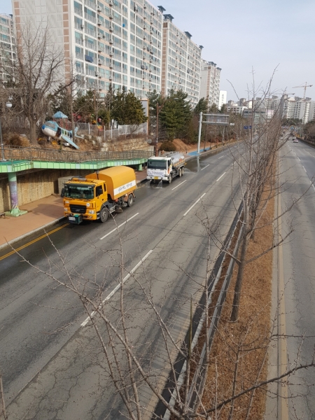 [한국Q뉴스] 아산시가 도로제설로 살포된 염화칼슘 잔여물로부터 시민들의 건강을 보호하고 깨끗한 도시환경을 조성하고자 주요도로 물청소를 실시했다.