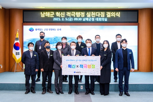 [한국Q뉴스] 남해군은 지난 5일 남해군청 대회의실에서 ‘혁신·적극행정 실천다짐 결의식’을 열고 2021년 군정 핵심 폭표인 ‘적극행정’에 박차를 가해 나갈 것을 다짐했다.