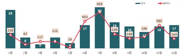 3~5월은 코로나19 확산 초기로 손씻기 등 개인위생이 철저해지면서 감소한 것으로 보이고 8~9월은 식중독이 집중 발생하는 시기임에도 6월 안산유치원 식중독 사고 후 7월에 유치원과 어린이집 전수점검 및 집단급식소 설치, 운영자에 대한 과태료 상향 추진 등 식중독 관리 강화에 따라 줄어든 것으로 분석된다.