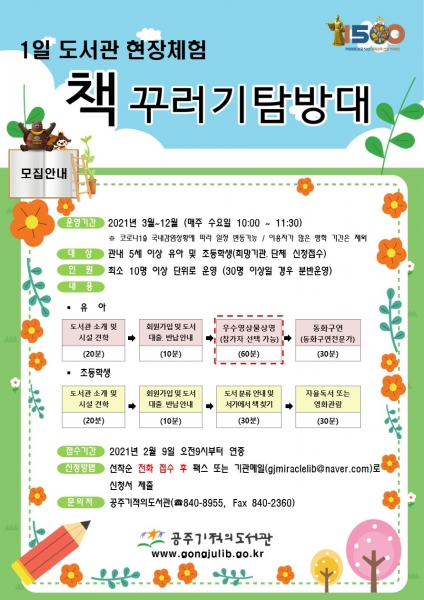 운영은 3월부터 12월까지 방학을 제외한 매주 수요일 오전 10시부터 90분 동안 공주기적의도서관에서 진행된다.