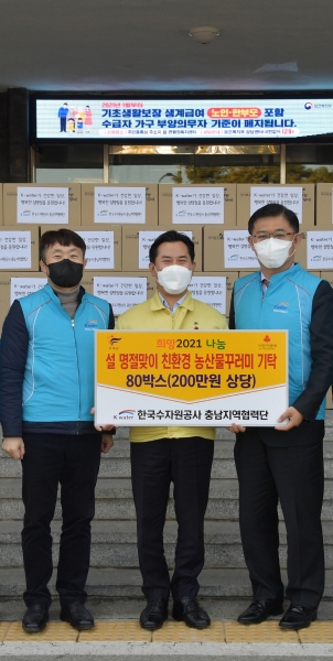 [한국Q뉴스] 한국수자원공사은 지난 4일 설 명절을 맞이해 친환경 농산물 꾸러미 80박스를 부여군에 기탁했다.