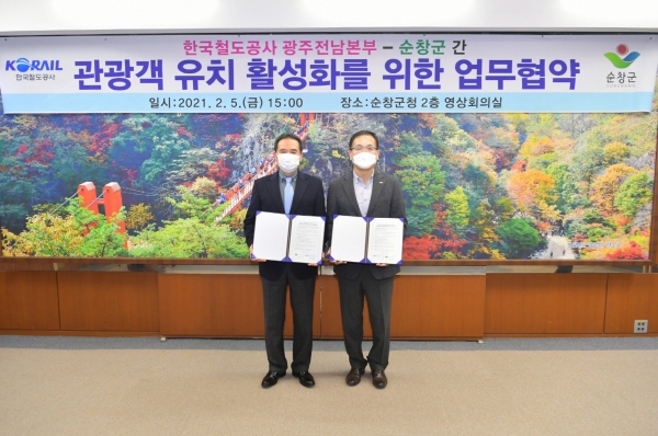 순창군은 최근 코레일 광주전남본부와 순창군청 2층 영상회의실에서 업무협약을 맺었다고 밝혔다.
