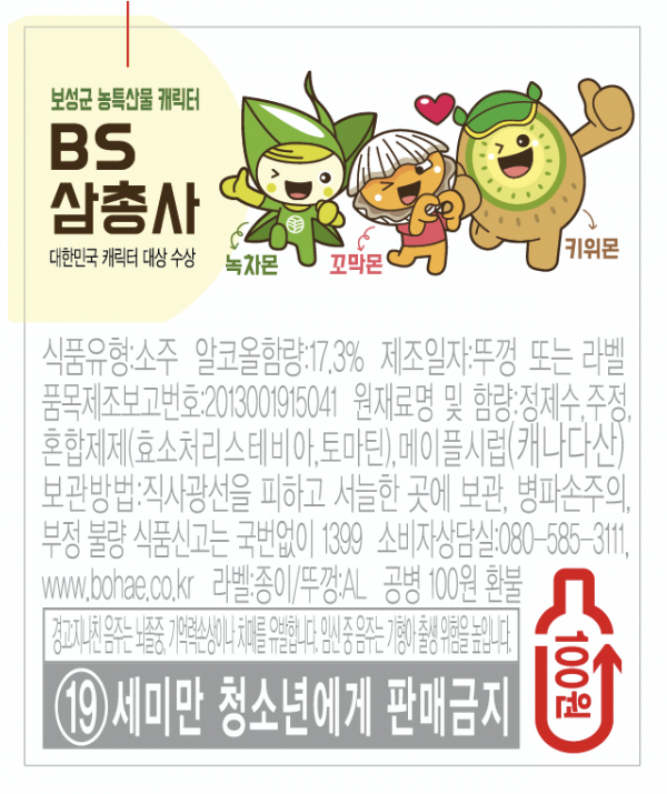 [한국Q뉴스] 보성군은 보해양조가 생산하는 ‘잎새주’ 라벨 후면에 보성군 농·특산물 홍보 캐릭터인 ‘BS삼총사’를 새겨 홍보에 들어갔다.