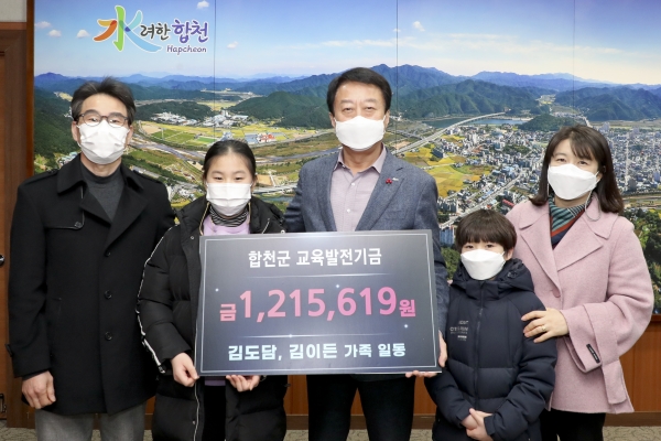[한국Q뉴스] 김종명, 박귀옥, 김도담, 김이든 가족 일동은 5일 오후 합천군교육발전위원회를 방문해 만기적금 1,215,619원을 합천군교육발전기금에 기탁했다.
