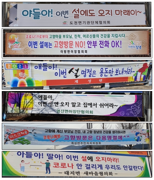 특히 ‘야들아 이번 설에도 오지마래이~’, ‘이번 설에는 고향방문 NO, 안부 전화 OK’, ‘얘들아 이번 설 명절은 용돈만 보내거라~’등 읍·면 각종 기관·사회단체에서는 특색 있고 참신한 문구를 활용한 현수막들을 게첩하면서 ‘설 명절 마음만 고향 방문하기 캠페인’의 분위기를 더욱 고취시키고 있다.