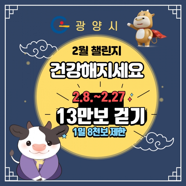 이번 걷기챌린지는 2월 8~27일 20일간 13만 보 이상 달성자 선착순 700명에게 상품혜택을 제공하며 매일 꾸준히 걷기 운동을 실천하도록 1일 최대 8천 보로 제한해 누구나 부담 없이 참여할 수 있다.