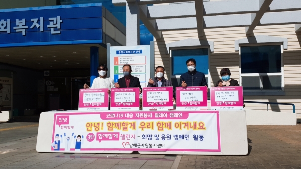 [한국Q뉴스] 남해군자원봉사센터는 8일 종합사회복지관 앞에서 남해군자원봉사단체 협의회의 참여로 코로나19 대응 자원봉사 릴레이 캠페인 제3탄 ‘우리 함께해요’ SNS 챌린지의 시작을 알렸다.